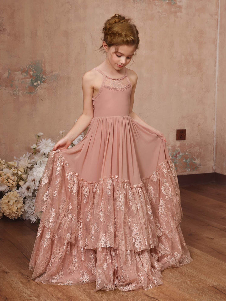 Ball-Gown Lace Long Sleeves Cap Straps Floor-Length Flower Girl Dresses