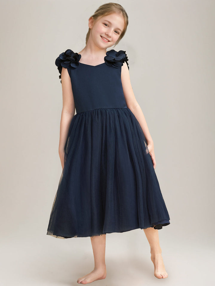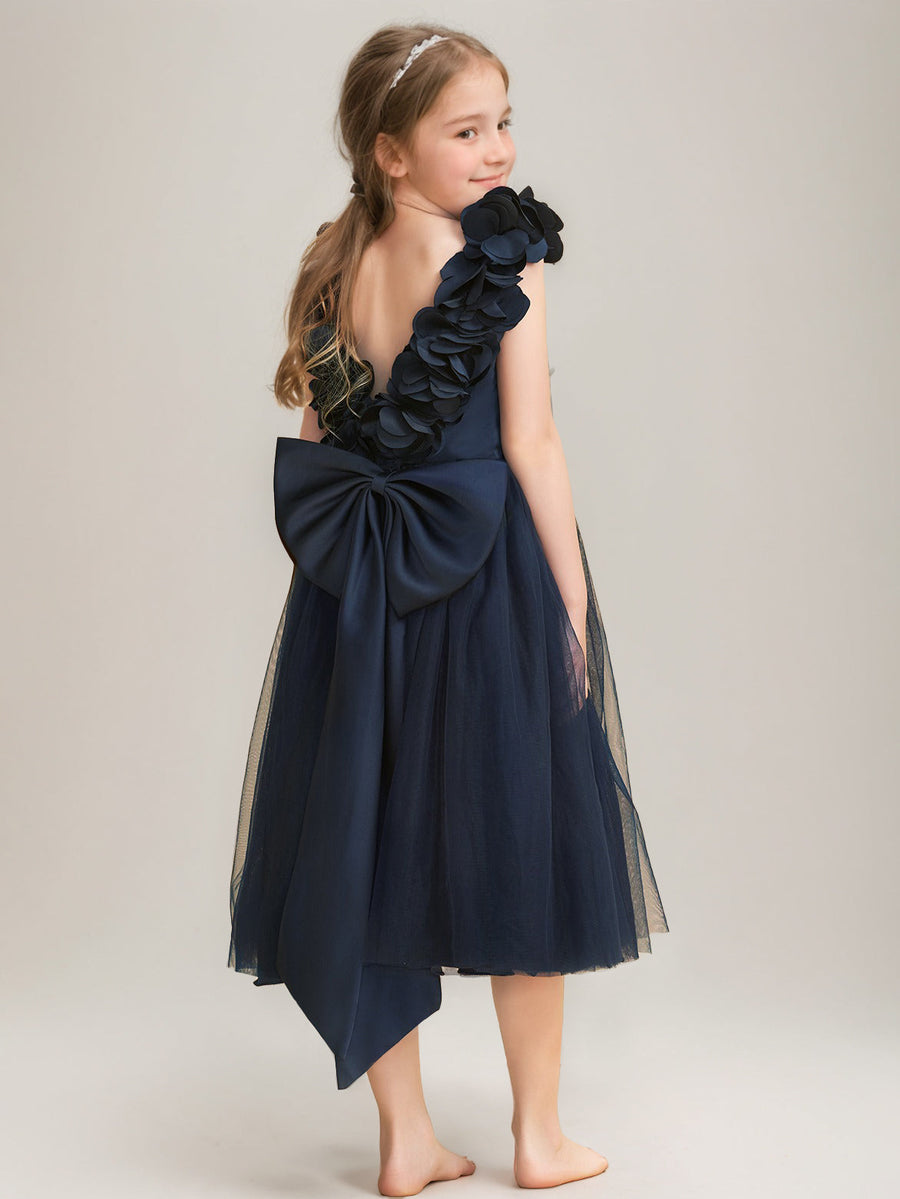 A-Line/Princess V-Neck Sleeveless Tea-Length Flower Girl Dresses with Bow & 3D Flowers
