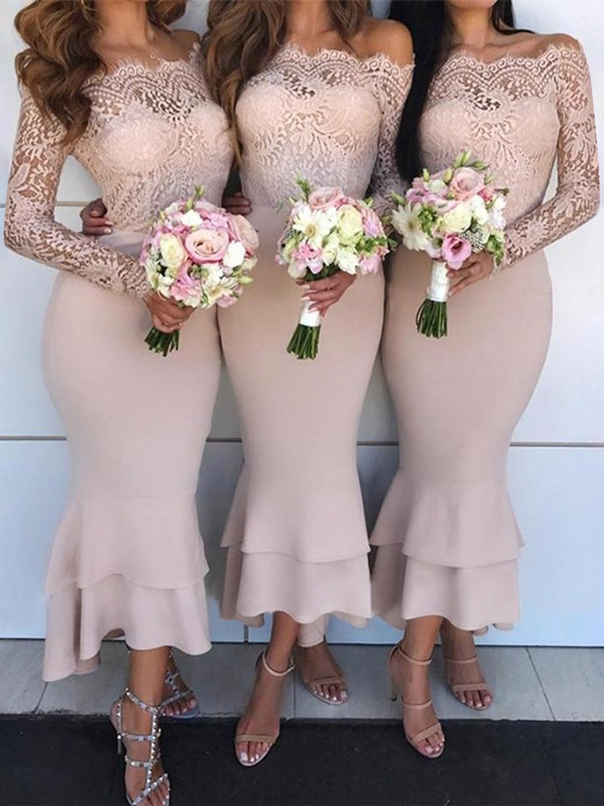 Trumpet/Mermaid Off-the-Shoulder Long Sleeves Asymmetrical Bridesmaid Dresses with Ruffles