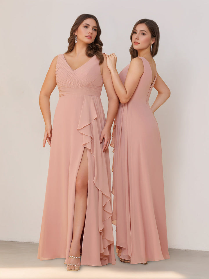 A-Line/Princess V-Neck Sleeveless Floor-Length Chiffon Plus Size Bridesmaid Dresses with Ruffles & Split Side