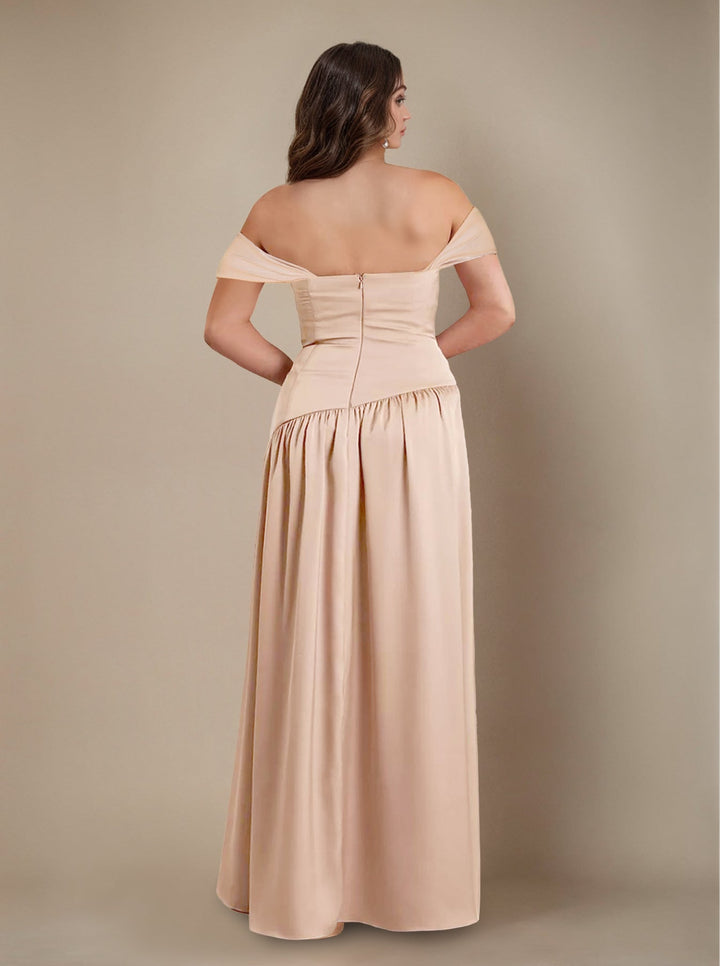 A-Line/Princess Off-the-Shoulder Sleeveless Floor-Length Silk Satin Bridesmaid Dresses with Pleated & Split Side