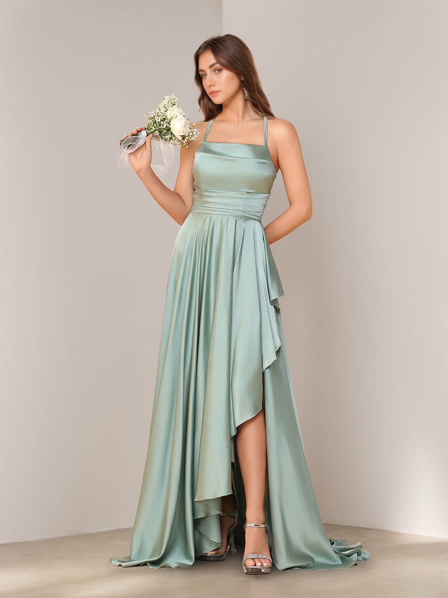 A-Line/Princess Spaghetti Straps Sleeveless Floor-Length Silk Satin Long Bridesmaid Dresses with Ruched & Split Side