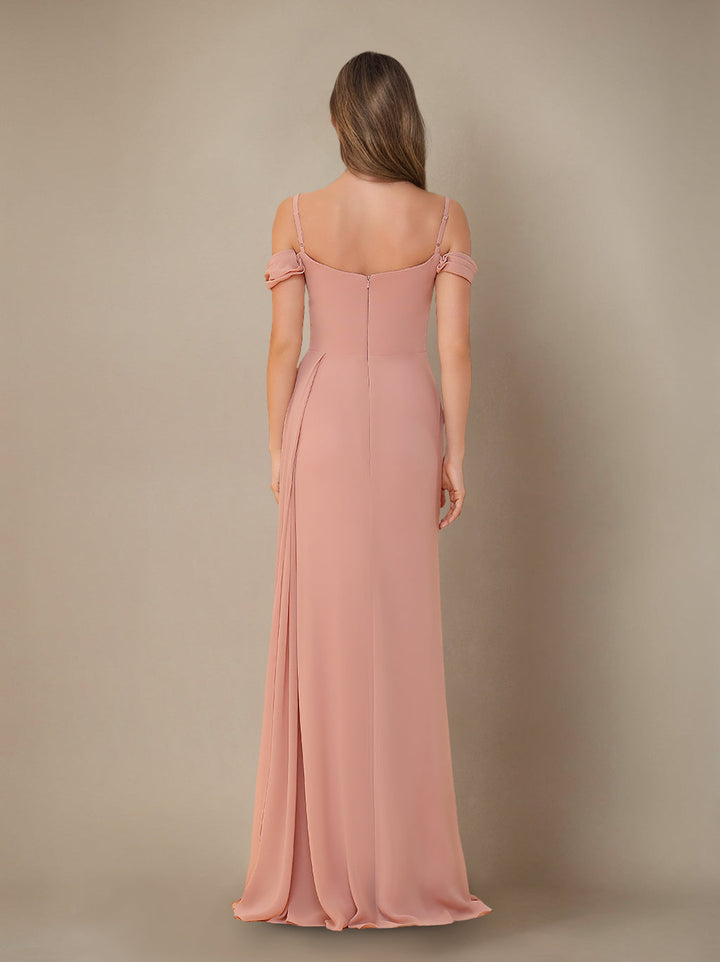 Sheath/Column Off-the-Shoulder Spaghetti Straps Floor-Length Bridesmaid Dress with Ruffles & Split Side