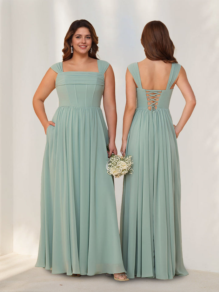 A-Line/Princess Square Neck Sleeveless Floor-Length Chiffon Plus Size Bridesmaid Dresses with Pleats