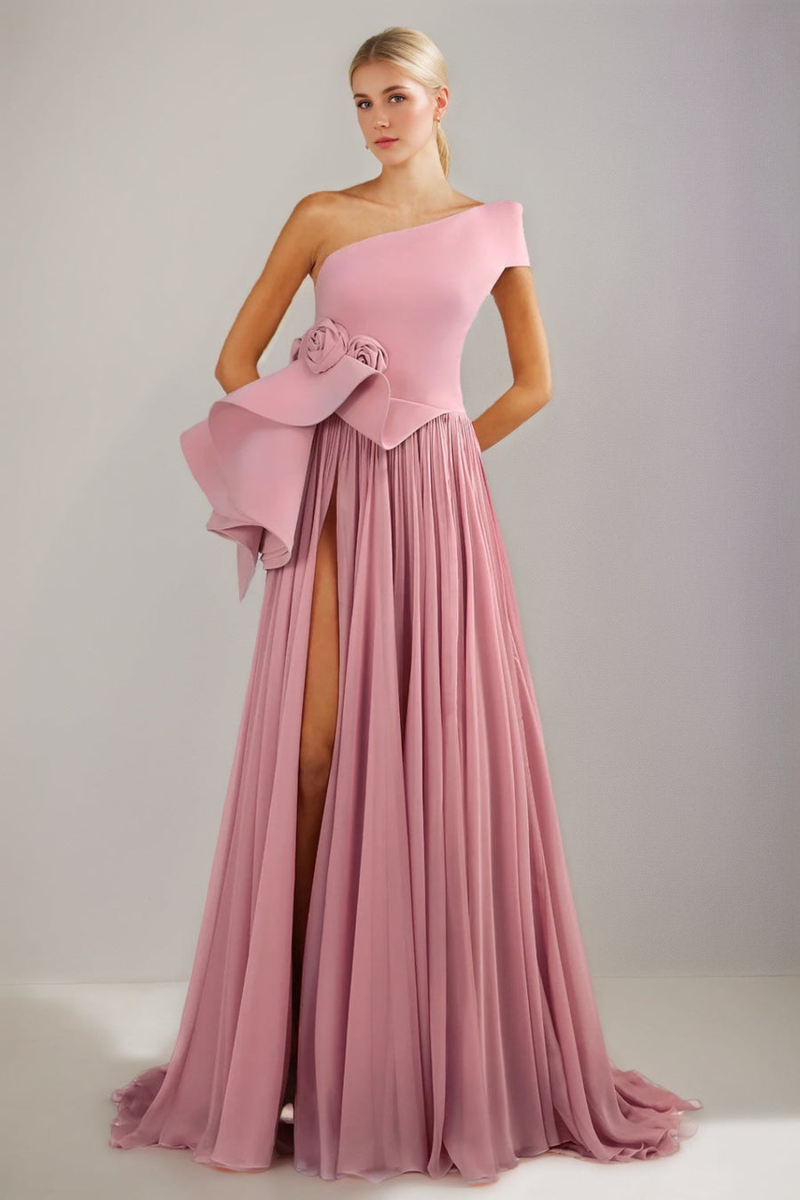 A-Line/Princess One-shoulder Floor-Length Pleated Evening Dresses with High Slit & Ruffles & 3D Flowers