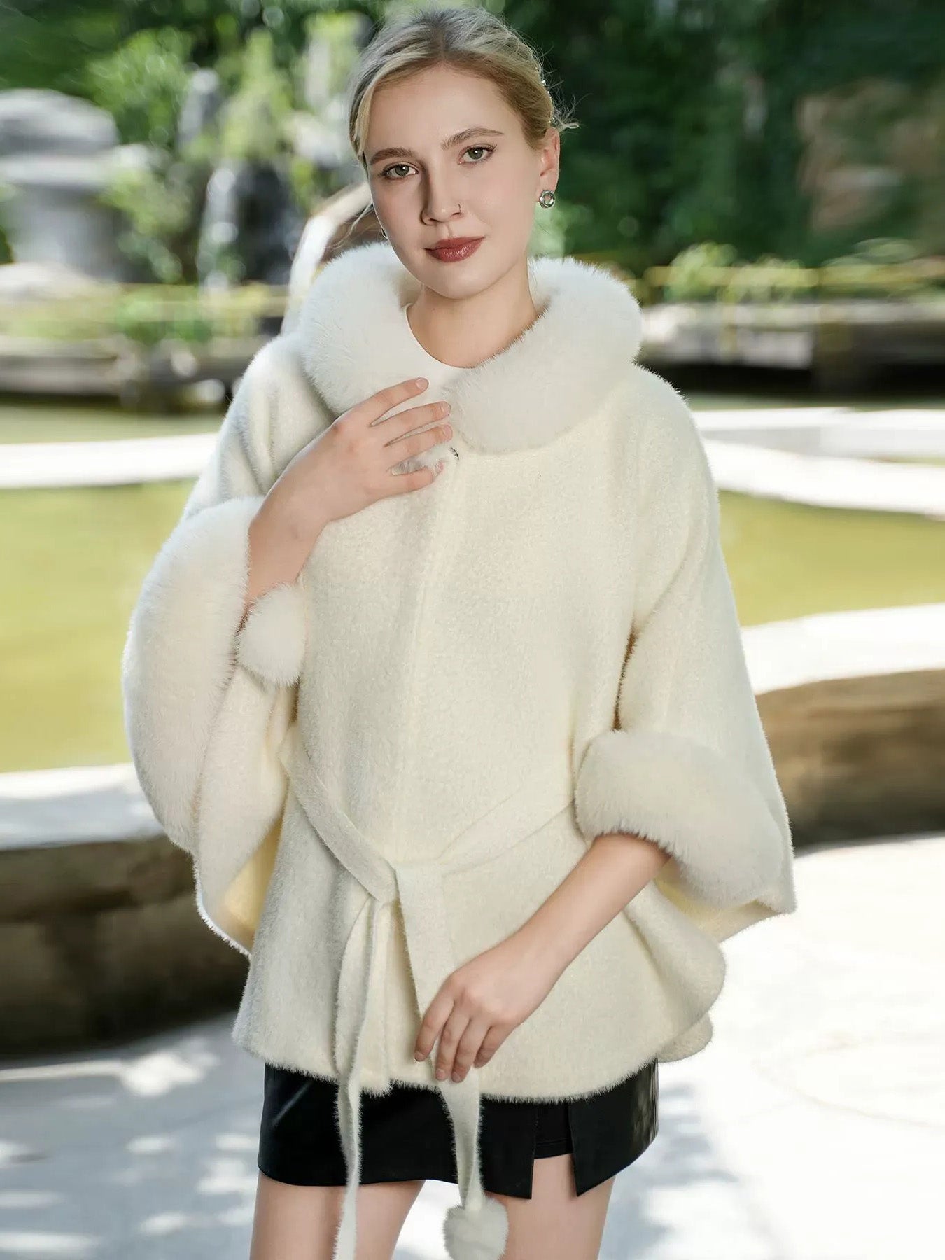 Elegant White Faux Fur Trim Belted Cape Shawl/Wrap for Women