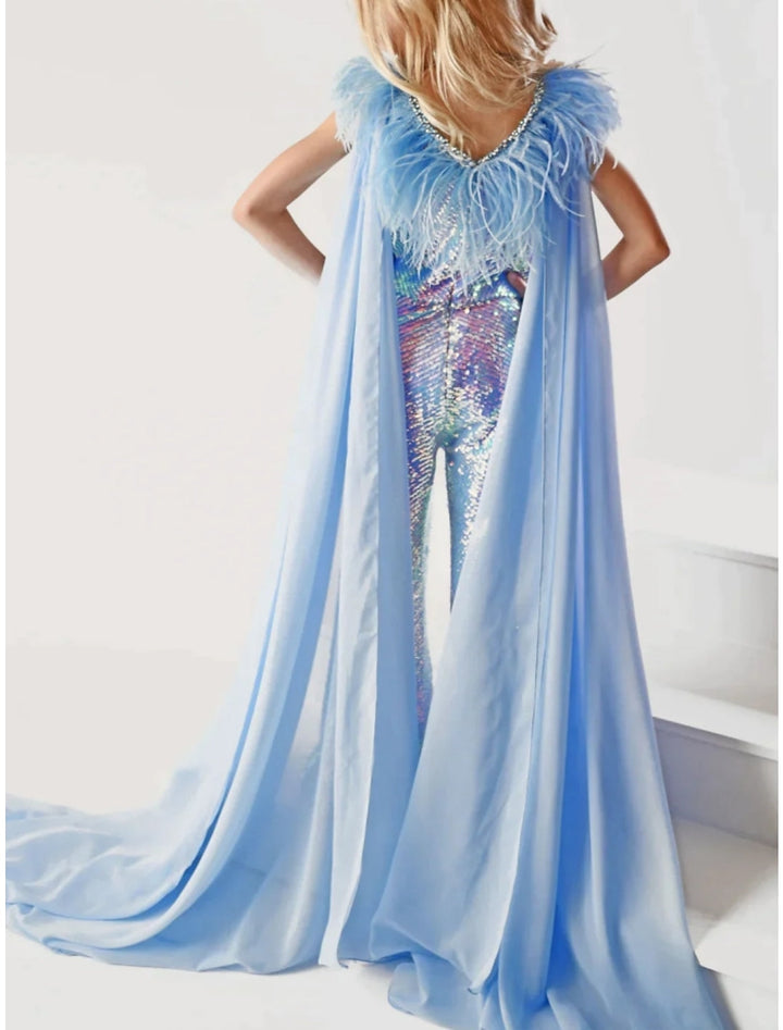 V-Neck Sleeveless Girls Rainbow Unicorn Jumpsuits with Feather & Watteau Train
