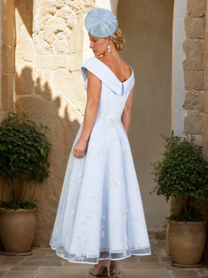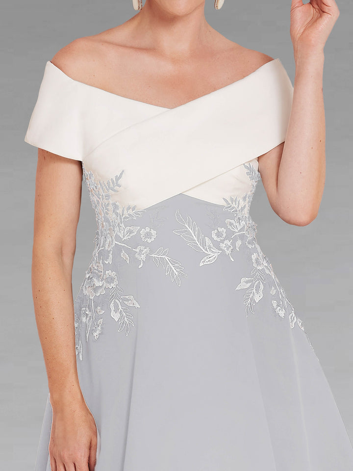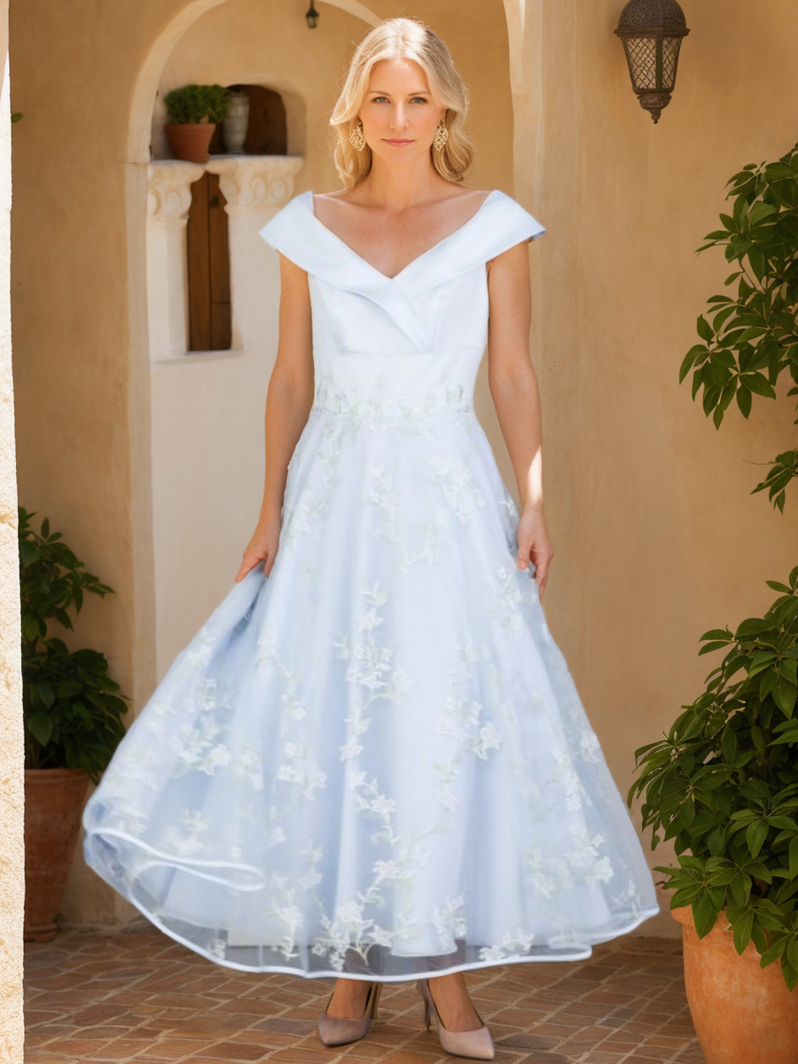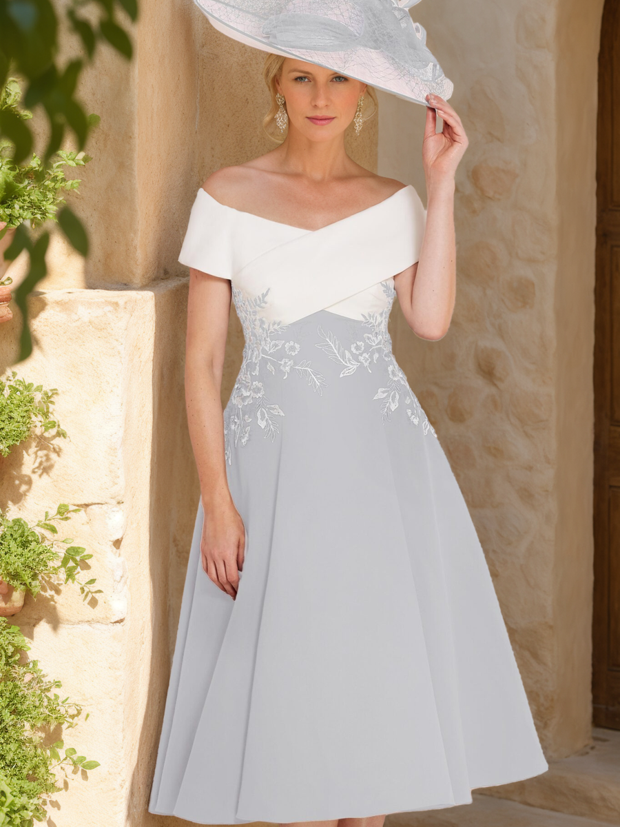 A-Line Princess Off-the-Shoulder Tea-Length Mother of the Bride Dresses with Lace Appliques