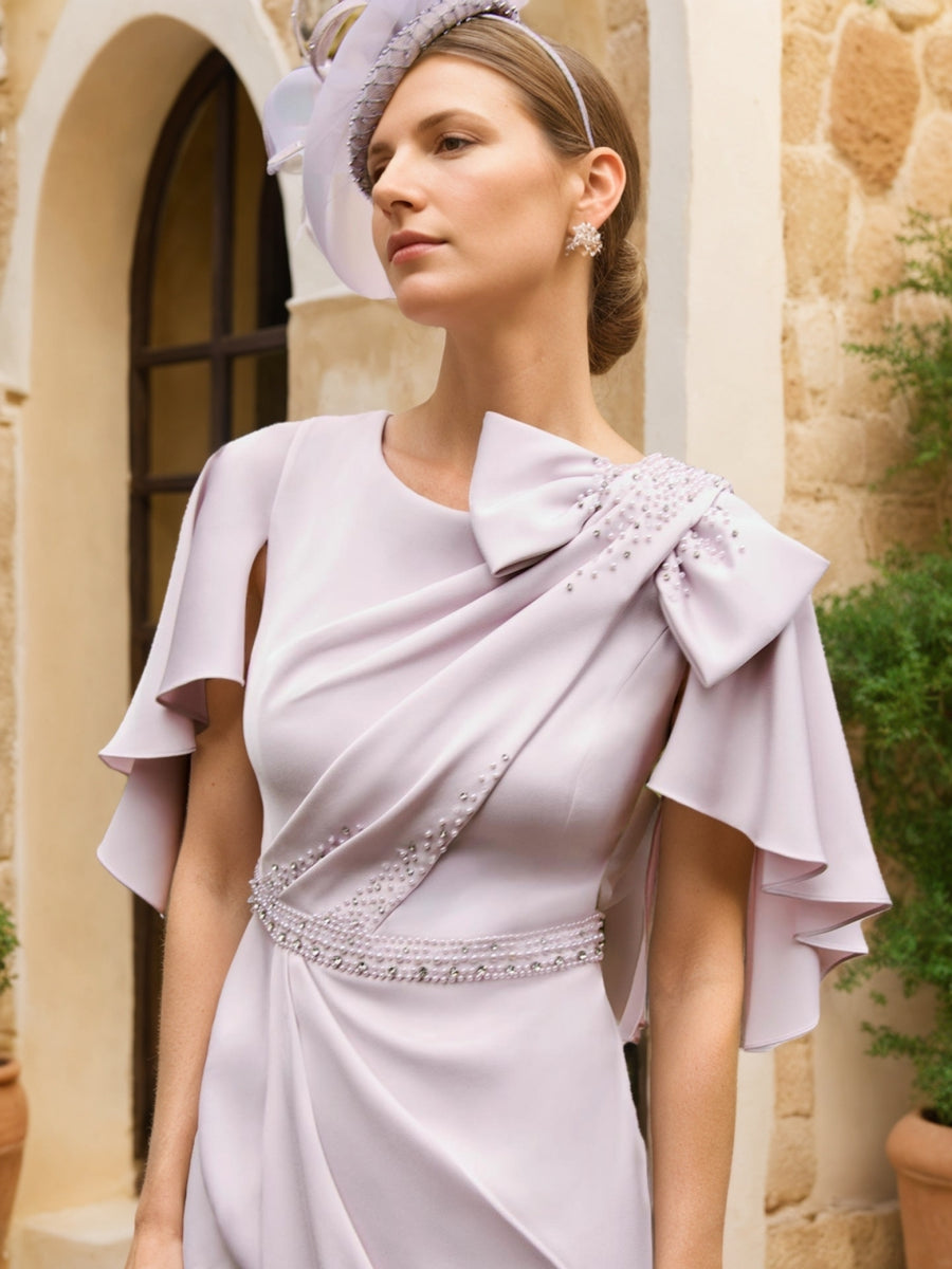Sheath/Column Round Neck Tea-Length Mother of the Bride Dresses with Cape Sleeves and a Bow