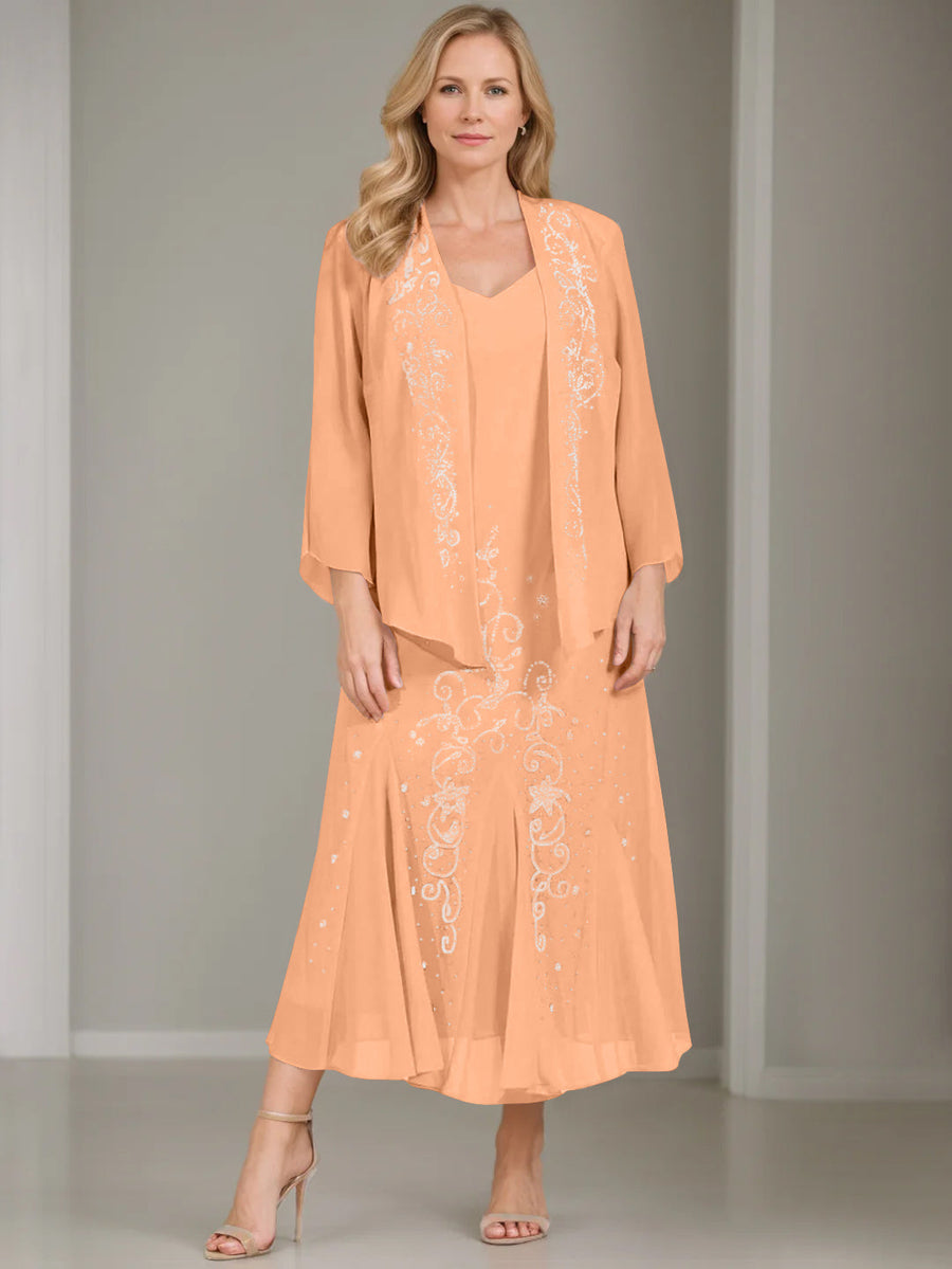 A-Line/Princess 2 Pieces V-Neck Tea-Length Plus Size Mother of the Bride Dresses with Jacket & Sequins