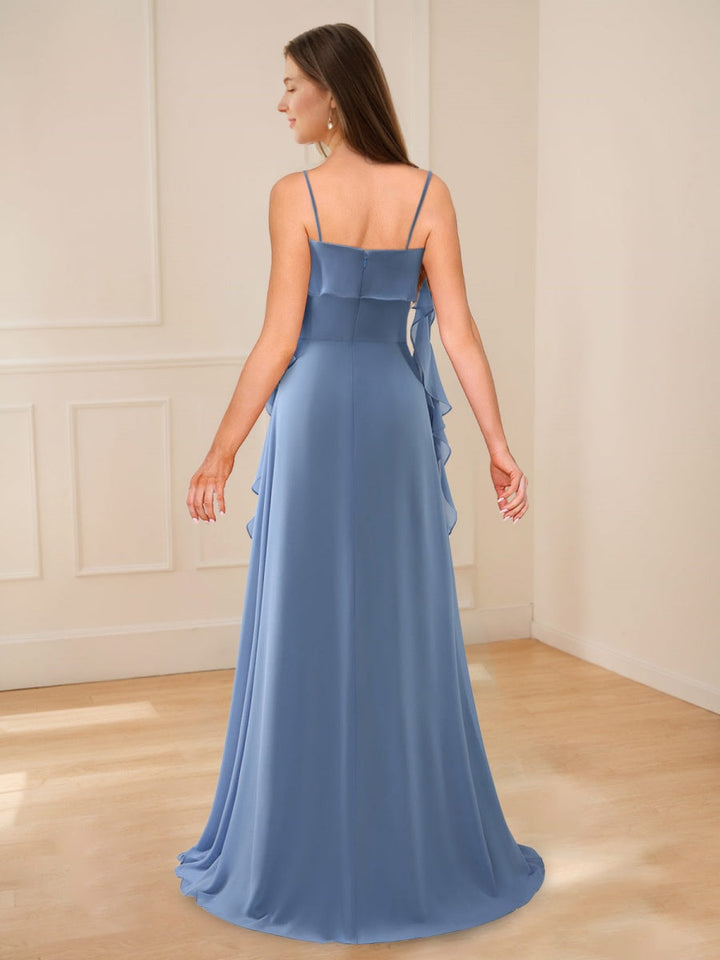 A Line/Princess Spaghetti Straps Sleeveless Floor-Length Bridesmaid Dresses with Split Side & Ruffles