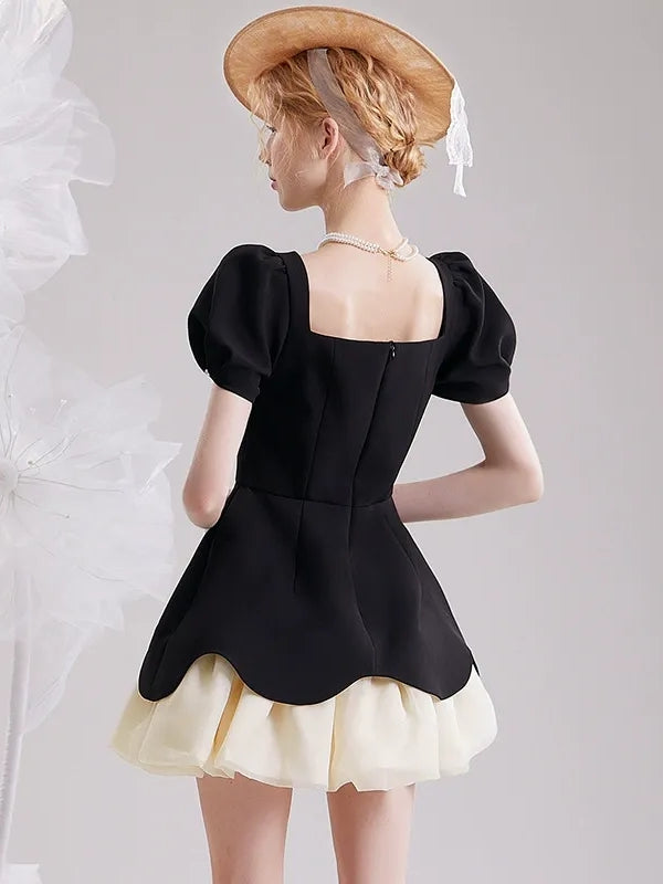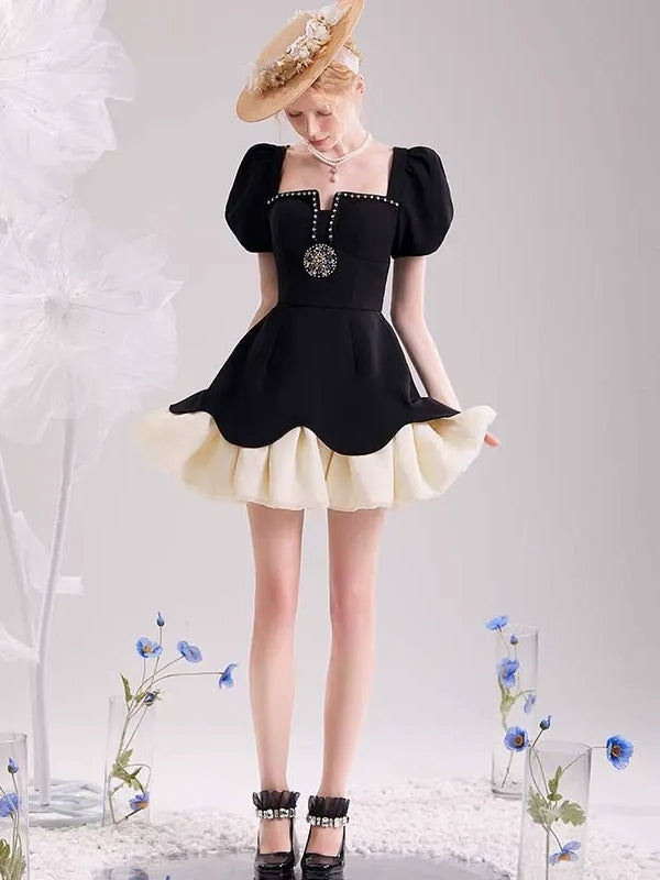 A-Line/Princess Square Neckline Puff Sleeves Mini/Short Pleated Vintage Dresses with Jewel Appliques & Ruffles