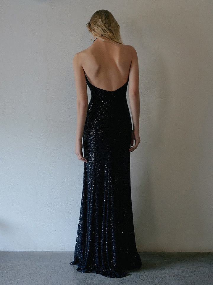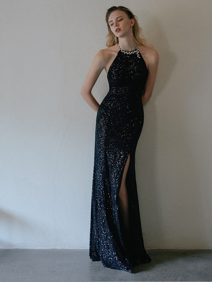 Trumpet/Mermaid Halter Sleeveless Backless Floor-Length Vintage Dresses with Slit & Sequins