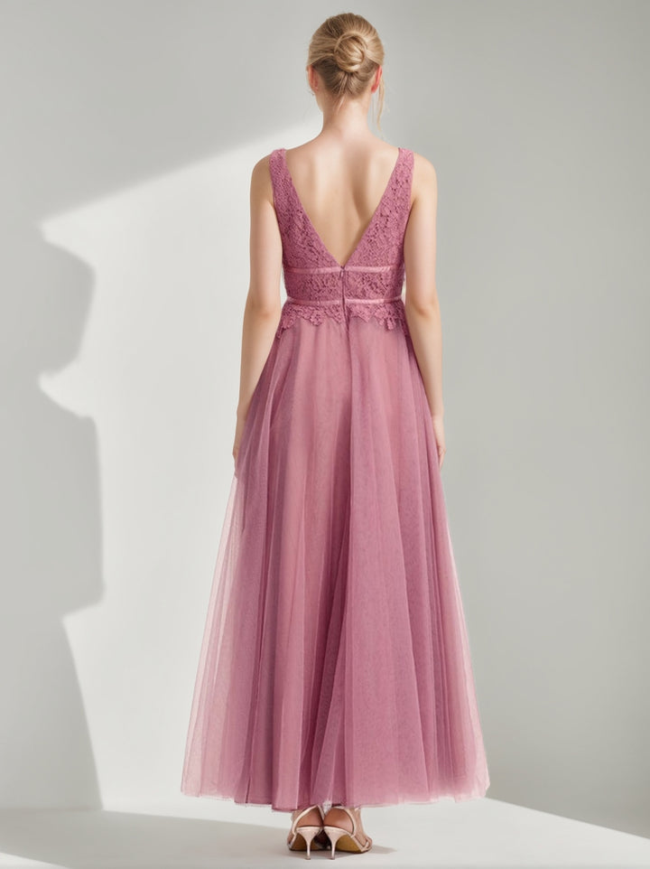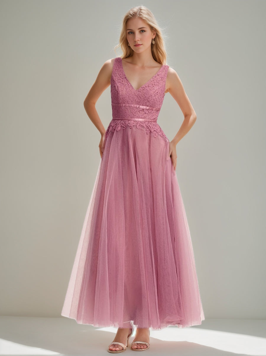 A-Line/Princess V-Neck Sleeveless Ankle-Length Wedding Guest Dresses with Ruffles & Lace Appliques