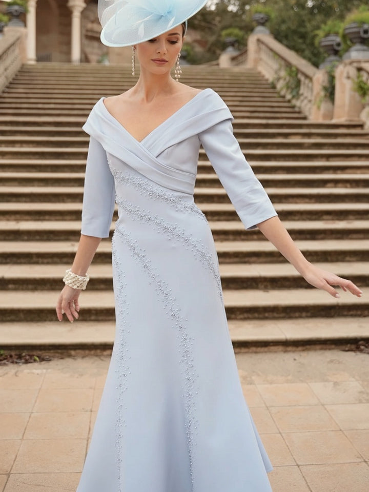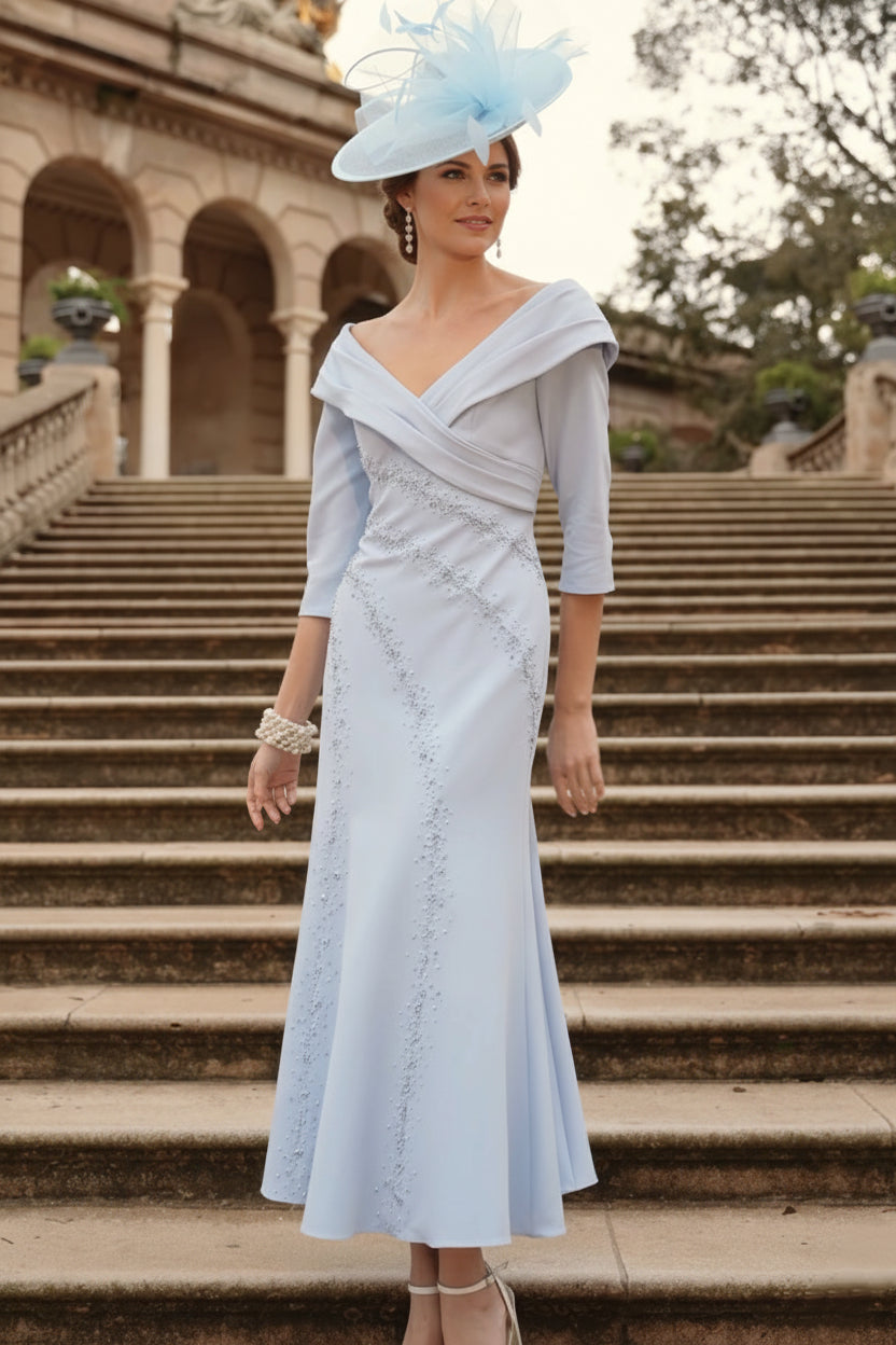 A-Line/Princess V-Neck 3/4 Sleeves Tea-Length Elegant Mother of the Bride Dresses with Rhinestone