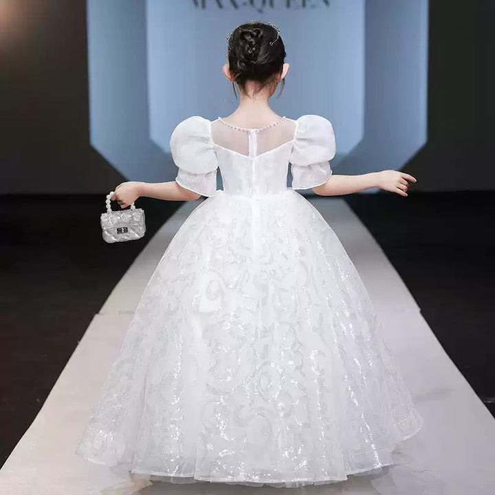 Ball Gown Beaded Round Neck Short Sleeves Flower Girl Dress with Crystal Appliques