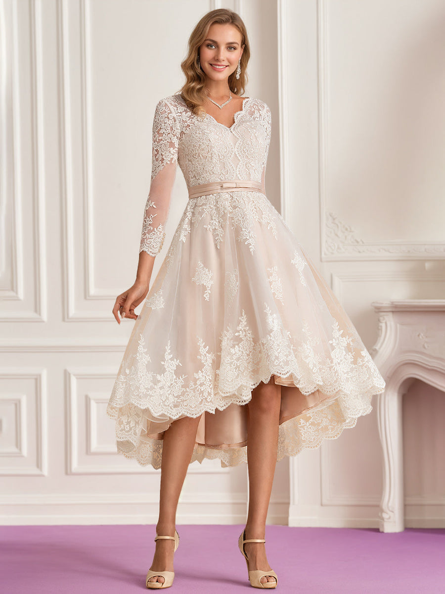 MON141522 A Line/Princess V-Neck 3/4 Length Sleeves Asymmetrical Wedding Dress with Lace Embroidery