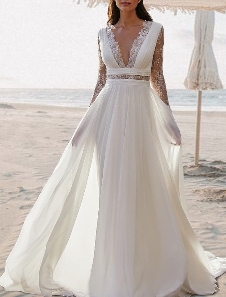 MON141173 A-Line/Princess V-Neck Floor-length Lace Wedding Dress