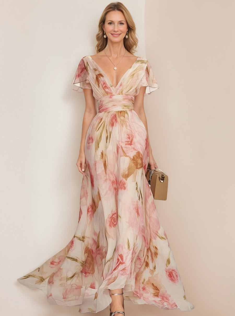 MON2312186 A-Line/Princess V-Neck Short Sleeves Printed Floral Mother of the Bride Dresses with Ruffles